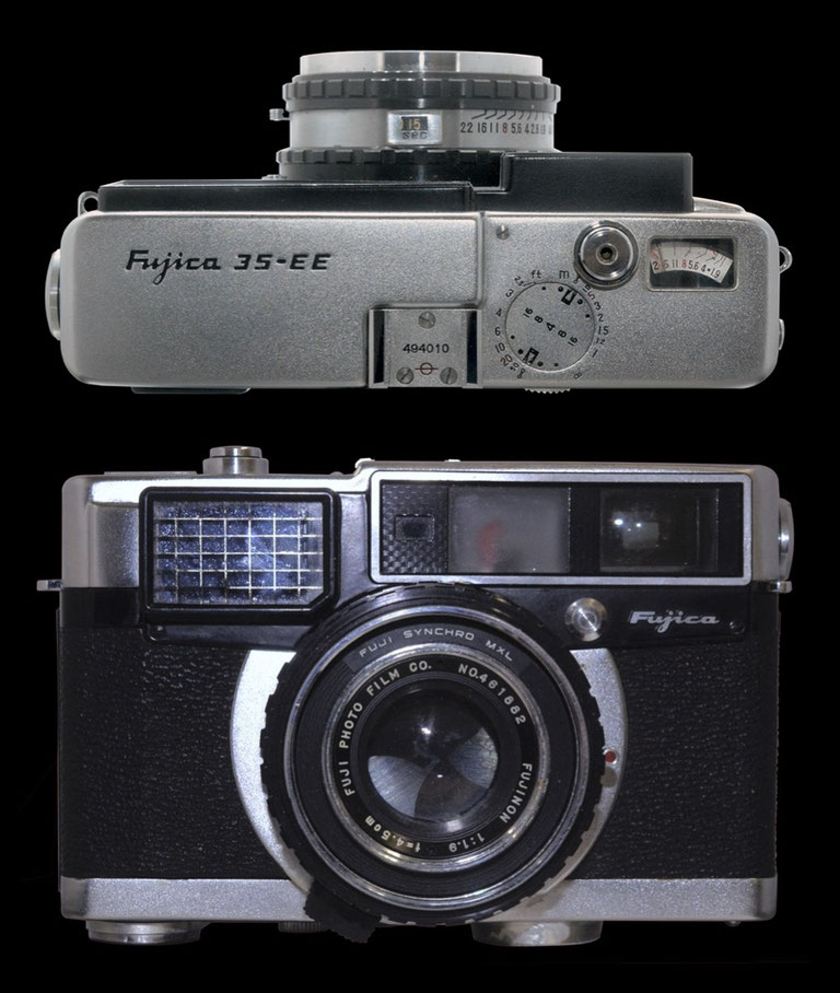FUJICA 35-EEは、シャッター速度優先EEおよびマニュアル操作可能の距離計連動式カメラです。距離計は。カメラの裏面右側上部に位置しており、Voigtlander :VITESS方式のダイヤル距離計を採用しています。巻き上げレバーは底部右側に付いています。巻き戻しクランクは左側面に付いており、フィルムの巻き上げに対して、90度の角度でクランクを回すユニークな構造となっています。巻き戻しクランクは、カメラの底面の右側についており、右手だけでチャージ、ピント、レリーズを行える設計で、これらのスタイルを、富士フィルムではフジカスタイルと言っています。セレン光電池による露出計指針で適正絞り値が表示される。絞りAUTOではシャッター速度優先EEとなり、絞りが自動調節される。この際、レリーズボタンが上に7mm飛び出す。また、連動範囲を越えて撮影もできる工夫もされている。文字で書くと難しそうな説明になりますが、とてもシンプルな操作で、ストレスなく撮影できるカメラです。これらのフジカスタイルの機構は、1957年の「FUJICA 35-M」に始ま「FUJICA 35ML」、「FUJICA 35-SE」、「FUJICA 35-SE」と受け継がれ、「1964年 FUJICA V2」まで受け継がれます。